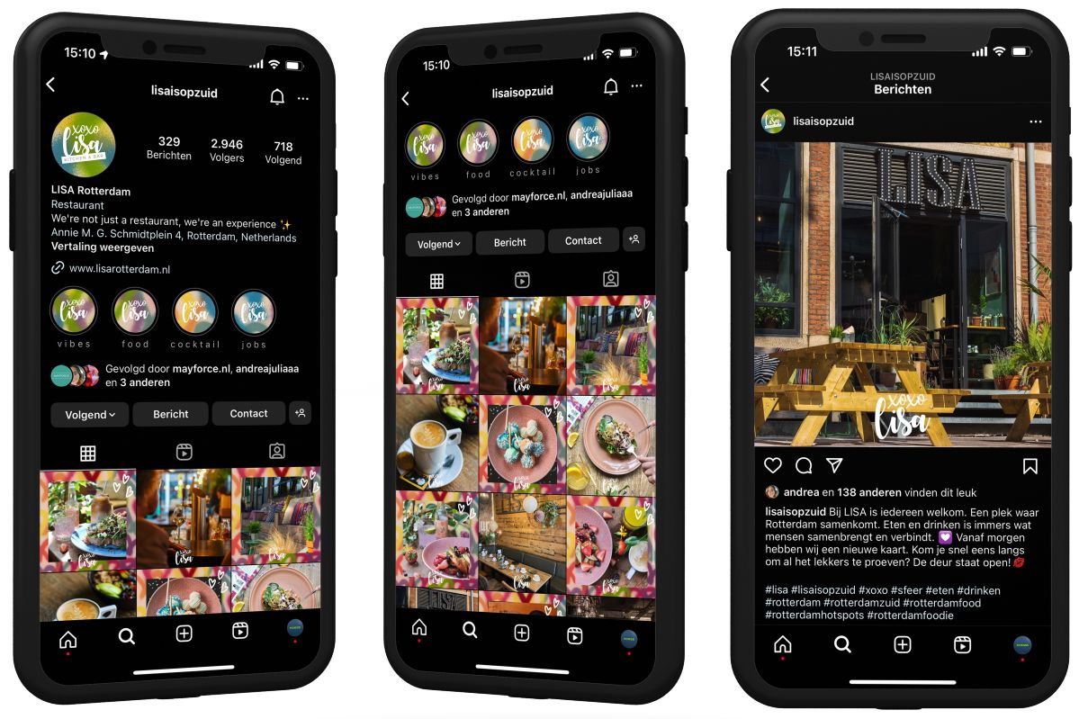 Als eerste is er voor consistentie gegaan en zijn er 2 verschillende afbeelding templates gemaakt voor de socials. Een kader waar het beeld herkenbaar door wordt en de volgers meteen aan het beeld herkennen dat het om content van LISA gaat. Vervolgens is er gekozen om een social content shoot te doen waarbij de gerechten, de sfeer en de mensen in de zaak beter tot zijn recht komen en het beeld perfect aansluit op het gewenste uit te dragen imago. Met een social media beheer pakket zorgen wij voor wekelijkse content op de feed, stories en wordt er gereageerd op de reacties.